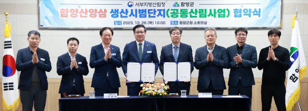 [금요저널] 함양군은 26일 오전 10시 군청 소회의실에서 서부지방산림청과 ‘함양 산양삼 생산시범단지 공동산림사업’ 업무협약을 체결했다.