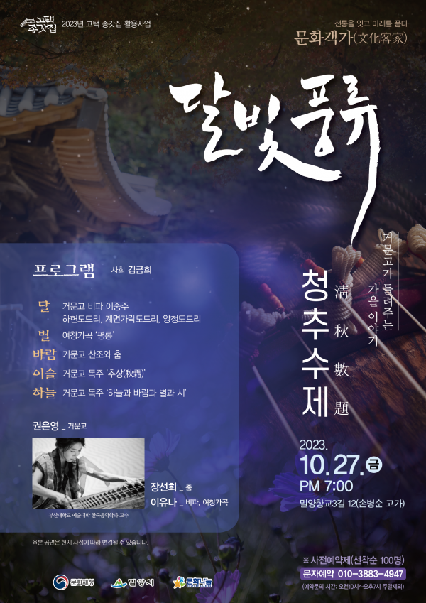 [금요저널] 밀양시는 오는 27일 오후 7시 교동 손병순 고가에서 고택종갓집 활용사업의 ‘달빛풍류’ 공연을 한다고 밝혔다.