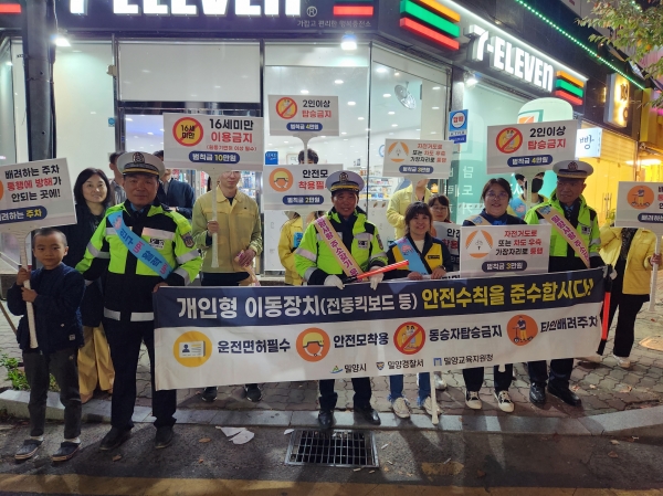 이날 행사는 밀양교육지원청, 모범운전자회, 녹색어머니연합회 기관단체 회원들이 함께 참여한 가운데 유동인구가 많고 개인형 이동장치 이용자가 많은 저녁 시간에 이뤄졌다.