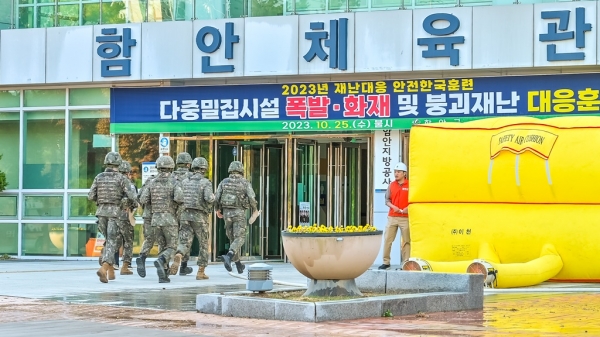 [금요저널] 함안군은 지난 25일 함안체육관에서 폭발·화재에 따른 다중밀집건축물 붕괴 재난상황을 대비한 2023년 재난대응 안전한국훈련을 실시했다.