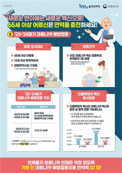 코로나19 예방접종 백신은 현재 발생하는 코로나19 변이에 적합한 XBB.1.5단가 백신으로 마지막 접종 90일 이후 1회만 접종하면 된다.
