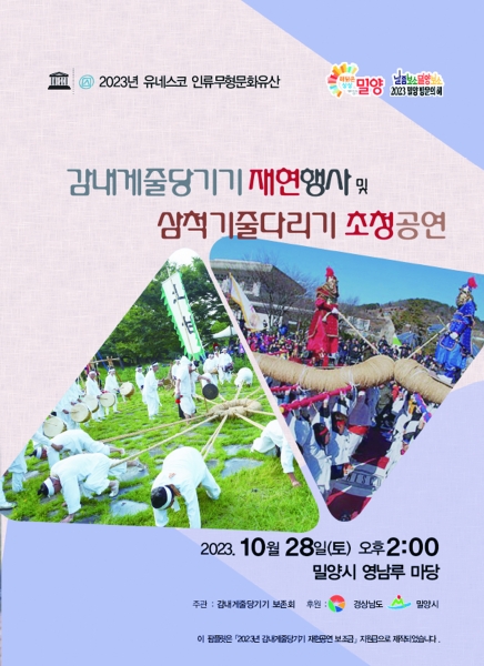 28일 오후 2시부터 펼쳐지는 경상남도 지정 무형유산 ‘감내게줄당기기 재현행사’는 밀양시 부북면 감천리에서 마을 사람들이 즐기던 민속놀이로 게 잡이를 하는데 좋은 자리를 먼저 차지하기 위한 주민들의 놀이에서 유래됐다고 한다.