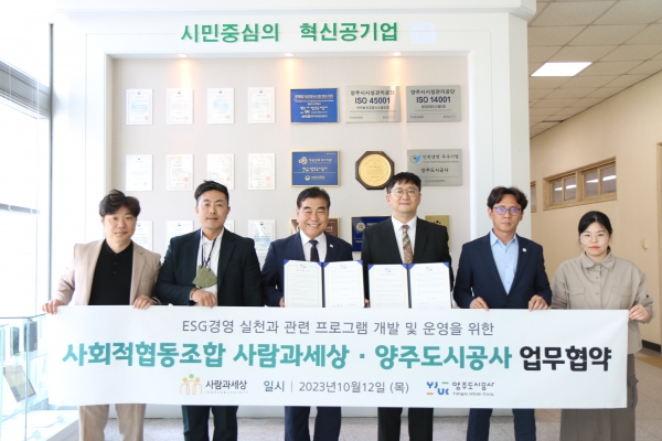 [금요저널] 양주도시공사는 ESG경영 실천과 ESG교육 활성화 노력의 일환으로 지난 12일 사회적협동조합 사람과 세상과의 업무협약을 진행했다고 27일 밝혔다.