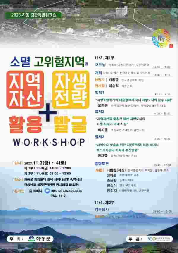 하동군이 주최하고 한국경관학회가 주관하는 이번 워크숍는 1부 3일 오후 2시∼5시, 2부 4일 오전 9시∼12시 2일에 걸쳐 온·오프라인으로 진행된다.