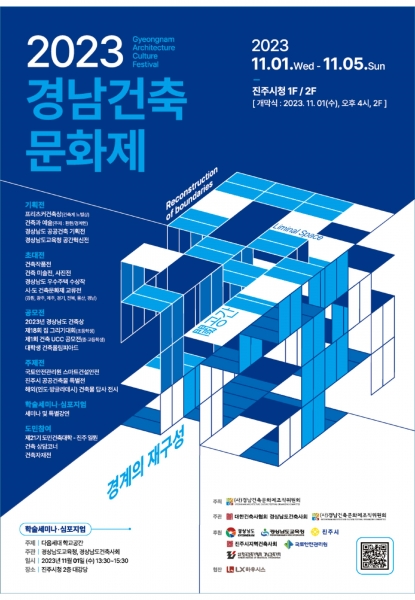 ‘2023 경남건축문화제’는 오는 11월 1일부터 5일까지 5일간 진주시청 특별전시장에서 ‘경계의 재구성’ 이라는 주제로 개최되며 오전 10시부터 오후 6시까지 무료로 관람할 수 있다.