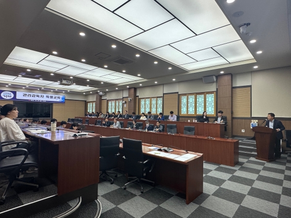 [금요저널] 거제시는 지난 27일 거제시 소속 관리감독자에 해당되는 부서장 및 면·동장 50여명이 참석한 가운데 거제시청 중회의실에서 산업안전에 관한‘관리감독자 특별교육’을 실시했다.