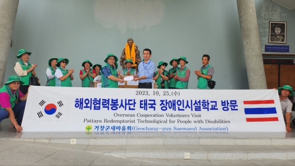 최두한 거창군새마을회장은 “새마을운동은 대한민국의 발전을 이끌어 온 국민운동으로 우리나라뿐만 아니라 세계가 더불어 잘 살고자 지구촌공동체운동을 전개해 새마을운동을 전파하고 있다”며 “파타야 장애인 시설학교에 작게나마 도움을 줄 수 있어 기쁘고 세계가 함께 잘사는 공동체로 발전하길 바란다”고 말했다.