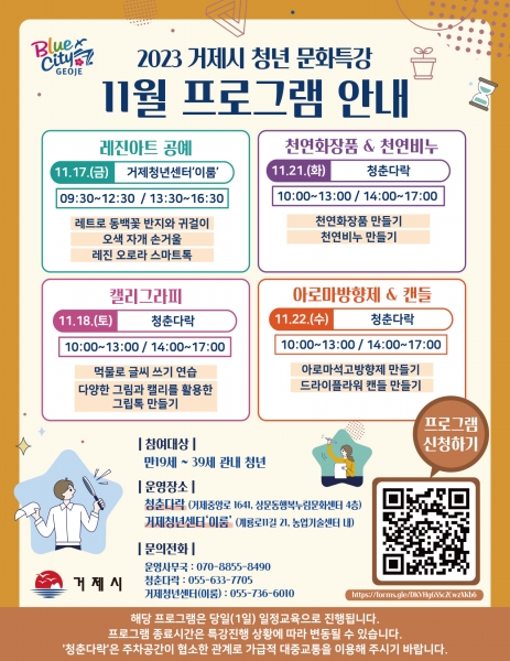 거제청년센터와 청춘다락에서 진행되며 수강료는 무료다.