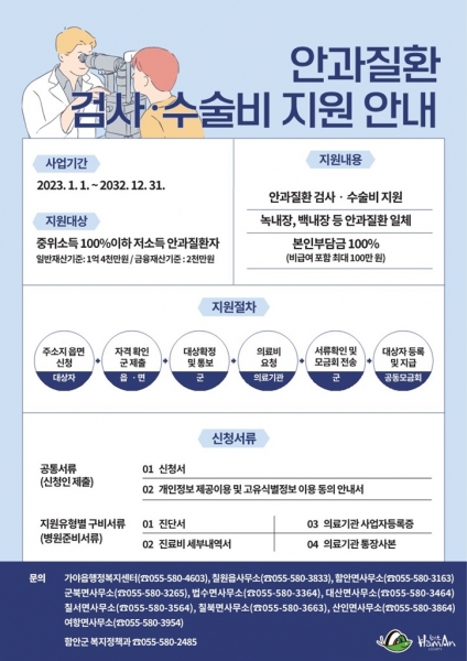한편 함안군은 안과질환 검사·수술비 지원 사업의 원활한 추진을 위해 전단지 배포, 언론보도, SNS 안내, 안과병원 홍보물 배치 및 캠페인 실시 등 다양한 홍보활동을 전개하고 있다.
