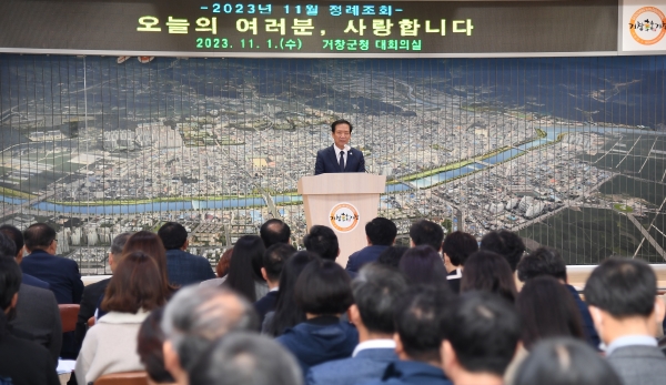 [금요저널] 거창군은 1일 ‘오늘의 당신을 사랑한다’라는 주제로 11월 직원 정례조회를 개최했다.