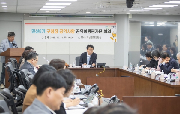 이날 회의에는 공약이행 평가단원 13명 및 담당부서장 26명이 참석했으며 2023년 3분기 기준 공약사업 추진실적 및 이행 상태를 점검하고 변경 내역에 대한 설명과 관련 의견을 청취했다.