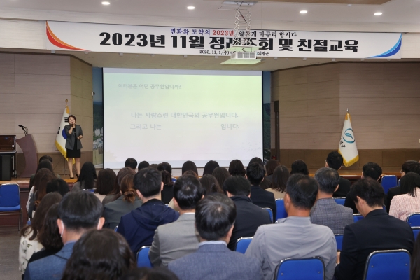 [금요저널] 의령군은 1일 군청 4층 회의실에서 직원 300여명이 참석한 가운데 11월 정례 조회 및 친절 교육을 실시했다고 밝혔다.