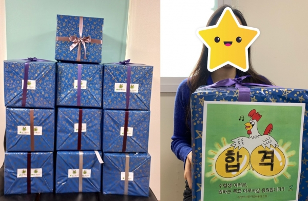 이번 응원 선물은 청소년들이 좋아하는 다양한 간식류 등으로 구성됐으며 합격을 기원하는 응원 메시지를 담아 정성스럽게 포장해 각 아동에게 전달됐다.