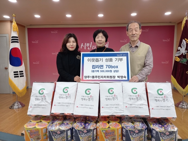 [금요저널] 양주시 양주1동 홈실추어탕이 지난 1일 양주1동 행정복지센터를 방문해 컵라면 70box을 기부했다.