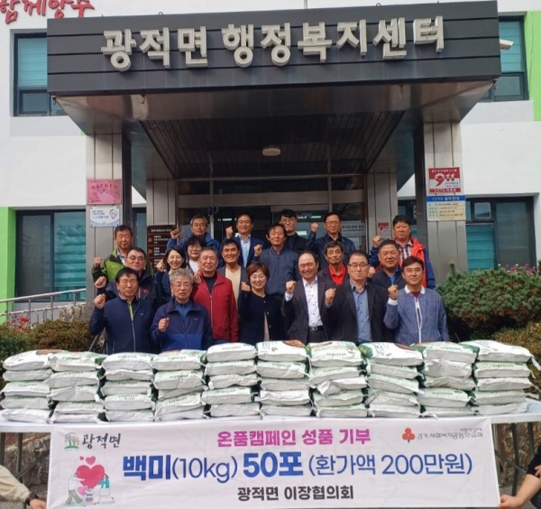 송수진 광적면장은 “매년 힘들게 농사지은 쌀을 특별한 관심과 사랑으로 기부해 주신 모든 이장님께 감사드린다”며 “어려운 경제 여건 속에 복지사각지대가 발생하지 않도록 행정에서도 최선을 다하겠다”고 말했다.
