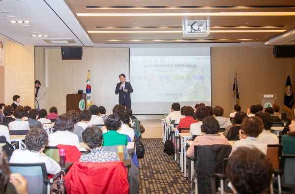 이날 ‘도시의 역사, 서구의 미래’라는 주제로 개최된 강연에서 강범석 구청장은 세계 유명 도시의 역사와 그 도시들이 발전할 수 있었던 원동력을 설명하면서 과거 인천의 변두리라는 인식이 강했던 서구와 현재 눈부신 발전을 이룬 서구의 앞으로의 발전 방향과 미래 비전을 수강생들과 공유했다.
