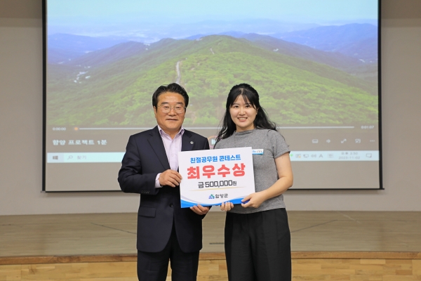 이날 보건소 건강증진과 이정은 주무관이 ‘친절을 만드는 힘’이라는 주제로 최우수상을 수상했으며 함양읍 김진혁 주무관이 우수상, 휴천면 박지윤·미래발전담당관 김근홍 주무관이 장려상을 수상했다.