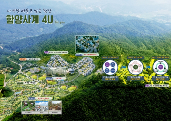 사업은 2024년부터 2027년까지 4년간 진행되며 주요 사업으로는 친환경 주거단지인 에코빌리지, 오도이촌 렌탈하우스, 친환경 복합캠핑존, 항노화 스마트팜, 4계절 지방정원, 친환경 대중골프장 등을 단계별로 조성해 사계절 머물 수 있는 함양을 조성할 계획이다.