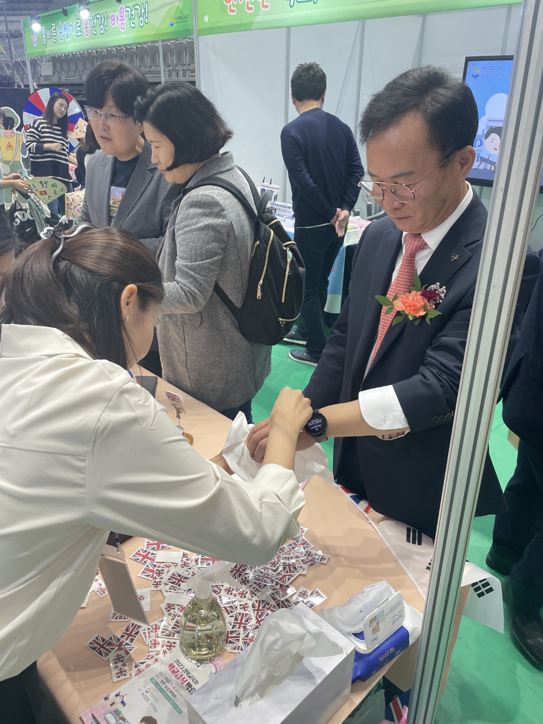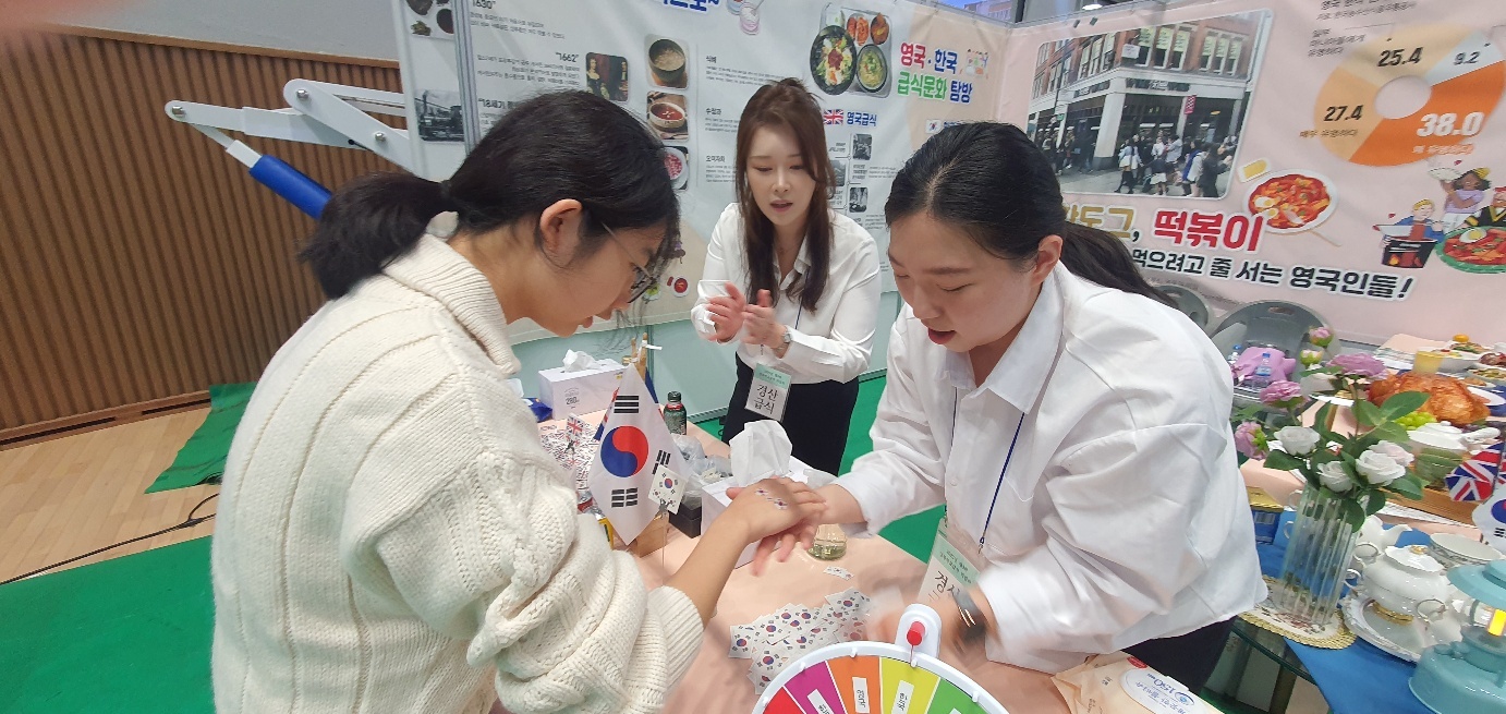 □ 이날 행사에서 경산교육지원청은 「K-급식 영국속으로!」라는 주제로 급식박람회 부스를 운영했다. 영국과 한국의 차(tea)와 급식문화를 비교함으로써 세계 식문화를 간접 체험해볼 수 있는 시간이었다. 특히 식판에 한상 차려진 음식 모형은 실물을 그대로 구현해 학생들과 학부모들의 눈길을 끌었다. 체험코너로는 한국과 영국의 국기를 활용한 타투 붙이기, 전통간식(약과, 스콘)과 전통음료(식혜, 홍차) 맛보기 등을 운영했다.
