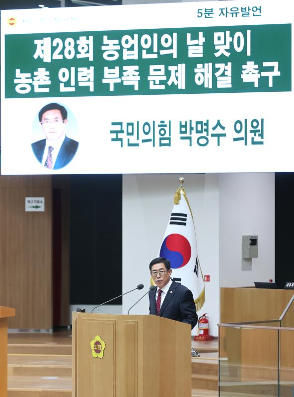 박명수 의원은 농민들의 긍지와 자부심을 고취시키고 농업의 중요성을 되새기는 농업인의 날을 맞아 우리 농촌이 직면한 인력 부족 문제를 해결하고자 발언에 나서게 됐다고 취지를 설명했다.