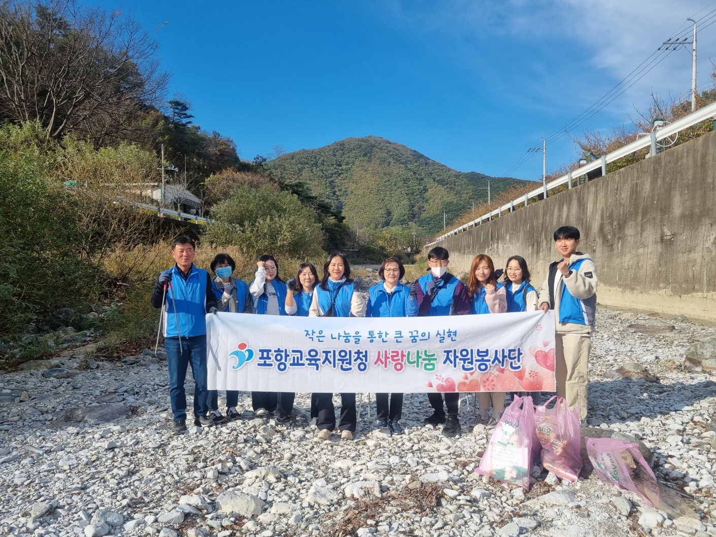 포항교육지원청(교육장 천종복) 평생교육건강과는 ‘사랑나눔 봉사활동’의 일환으로 11월 8일(수) 포항시 송라면에 위치한 내연산보경사시립공원을 방문하여 등산로 주변 환경 정화 활동에 나섰다.