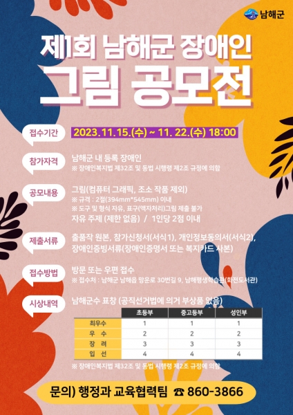 이번 공모전은 남해군 내 등록장애인은 누구나 참가할 수 있으며 그림 작품을 자유주제로 1인당 2점 이내로 접수할 수 있다.