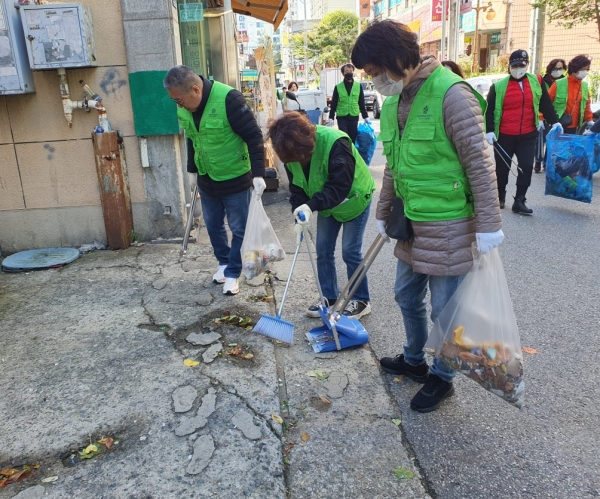 참석자들은 전날 비바람으로 쌓인 낙엽을 걷어내며 배수구를 정비하고 도로변과 골목 구석구석에 버려진 담배꽁초, 전단지, 생활용품 등의 쓰레기를 수거하며 구슬땀을 흘렸다.