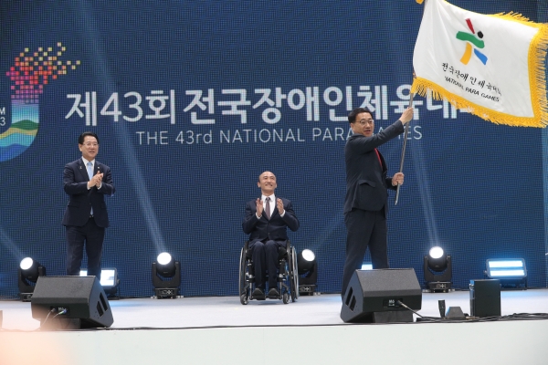 최만림 행정부지사는 지난 8일 목포실내체육관에서 열린 제43회 전국장애인체전 폐회식에서 정진완 대한장애인체육회장으로부터 2024년 제44회 전국장애인체전 대회기를 전달받았다.
