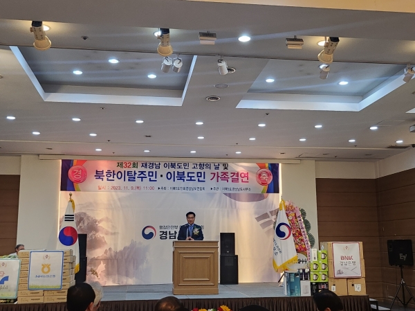이북도민회 경상남도연합회 주최로 열린 이날 행사는 유공자 표창, 대회사, 축사, 고령자 격려품 전달, 북한이탈주민·이북도민 가족 결연 등의 순으로 진행됐다.