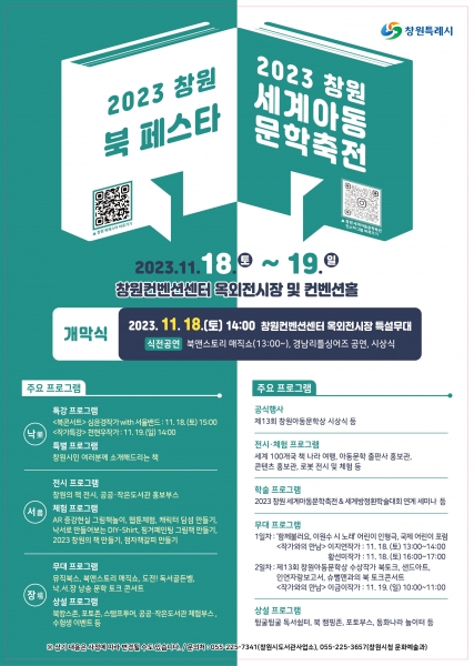 [금요저널] 창원특례시는 11월 18일부터 19일 이틀 동안 창원컨벤션센터 야외전시장과 컨벤션홀에서 ‘2023 창원 북 페스타와 창원세계아동문학축전’을 함께 개최한다 창원 북 페스타는 공공도서관, 작은도서관, 지역서점, 문학관, 지역출판사 등 25개 독서 유관기관이 참가하는 독서문화축제이며 창원 세계아동문학축전은 지난 2011년 창원을 아동문학의 수도로 선포하면서 개최해온 아동문학전문축제이다.