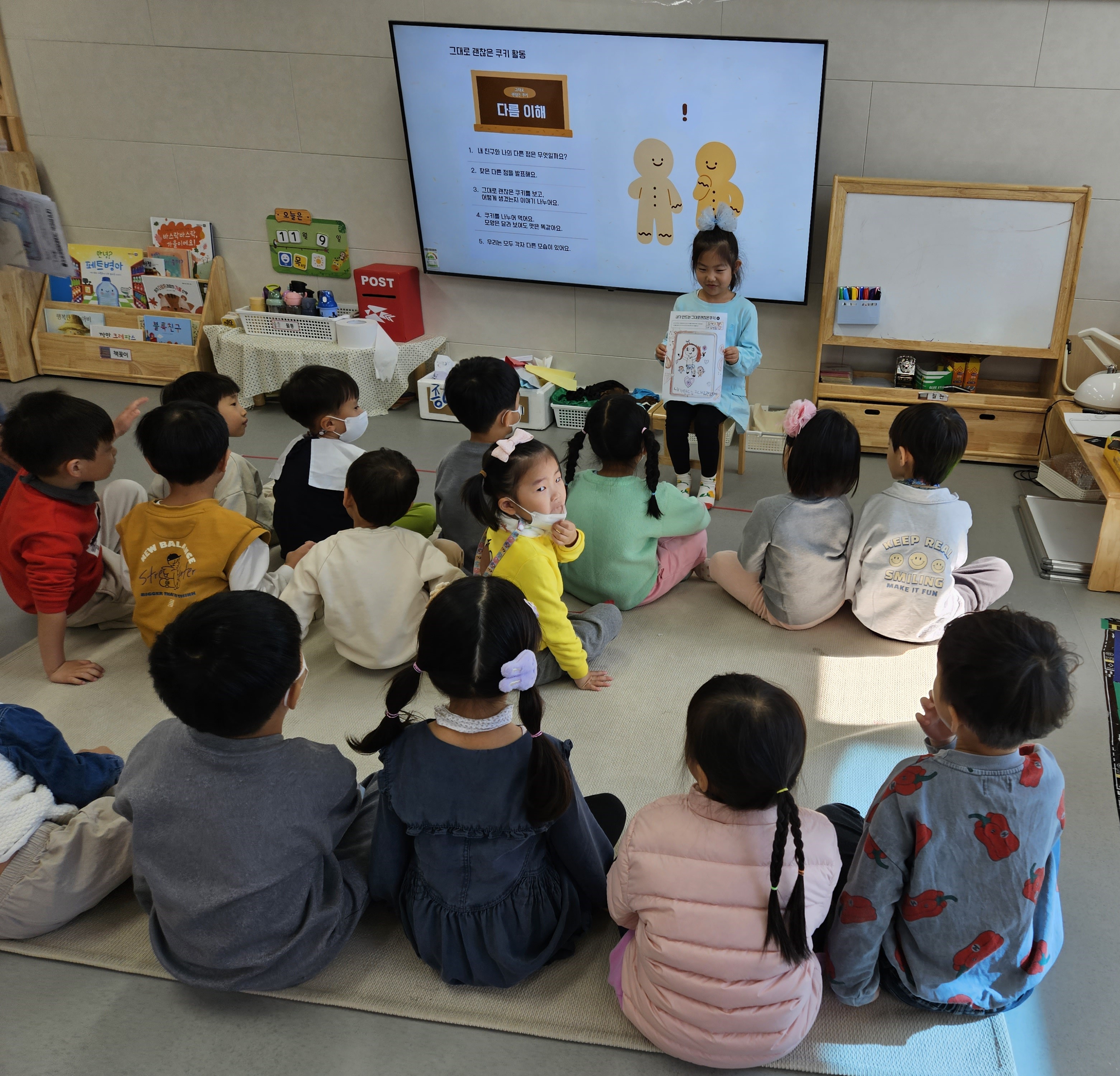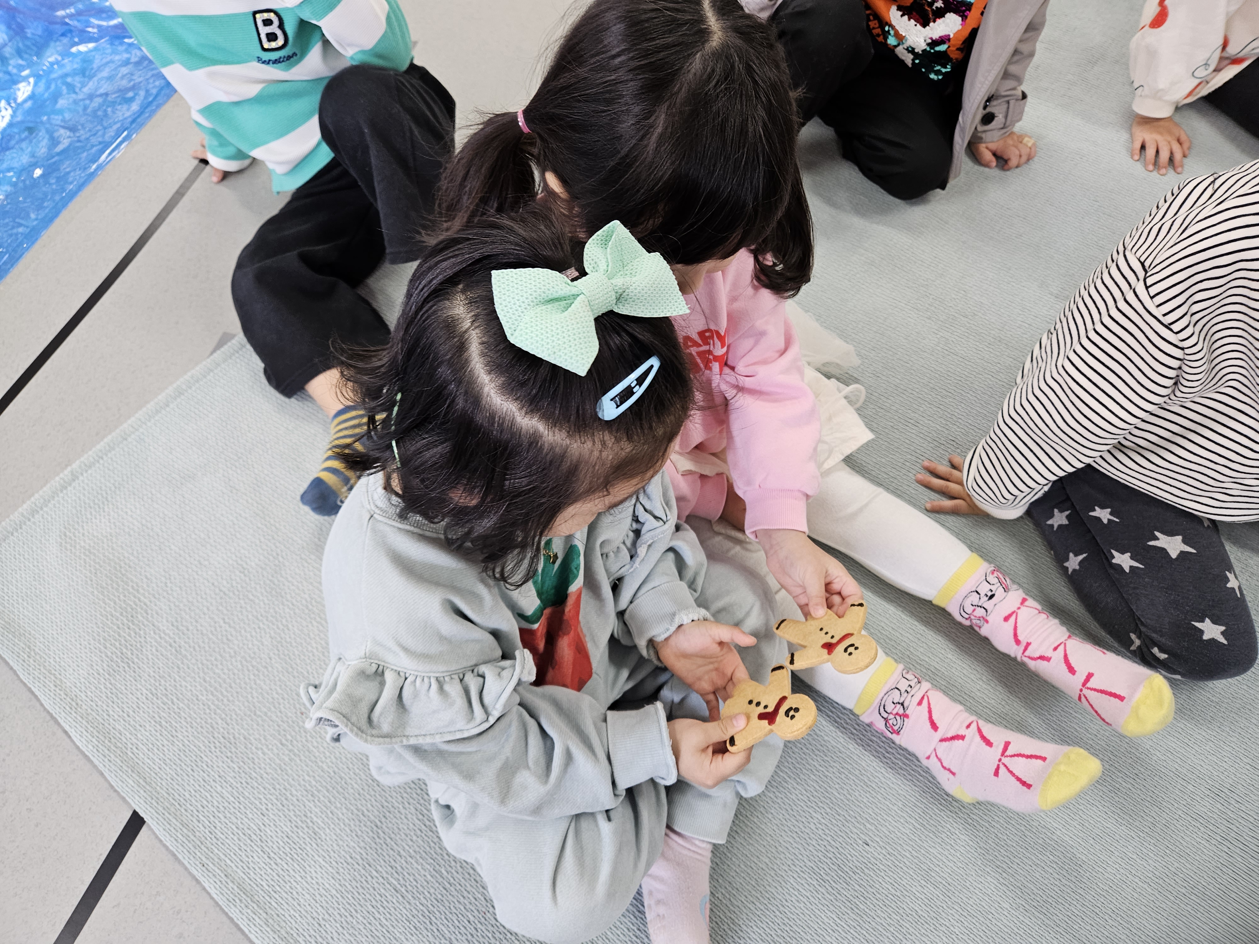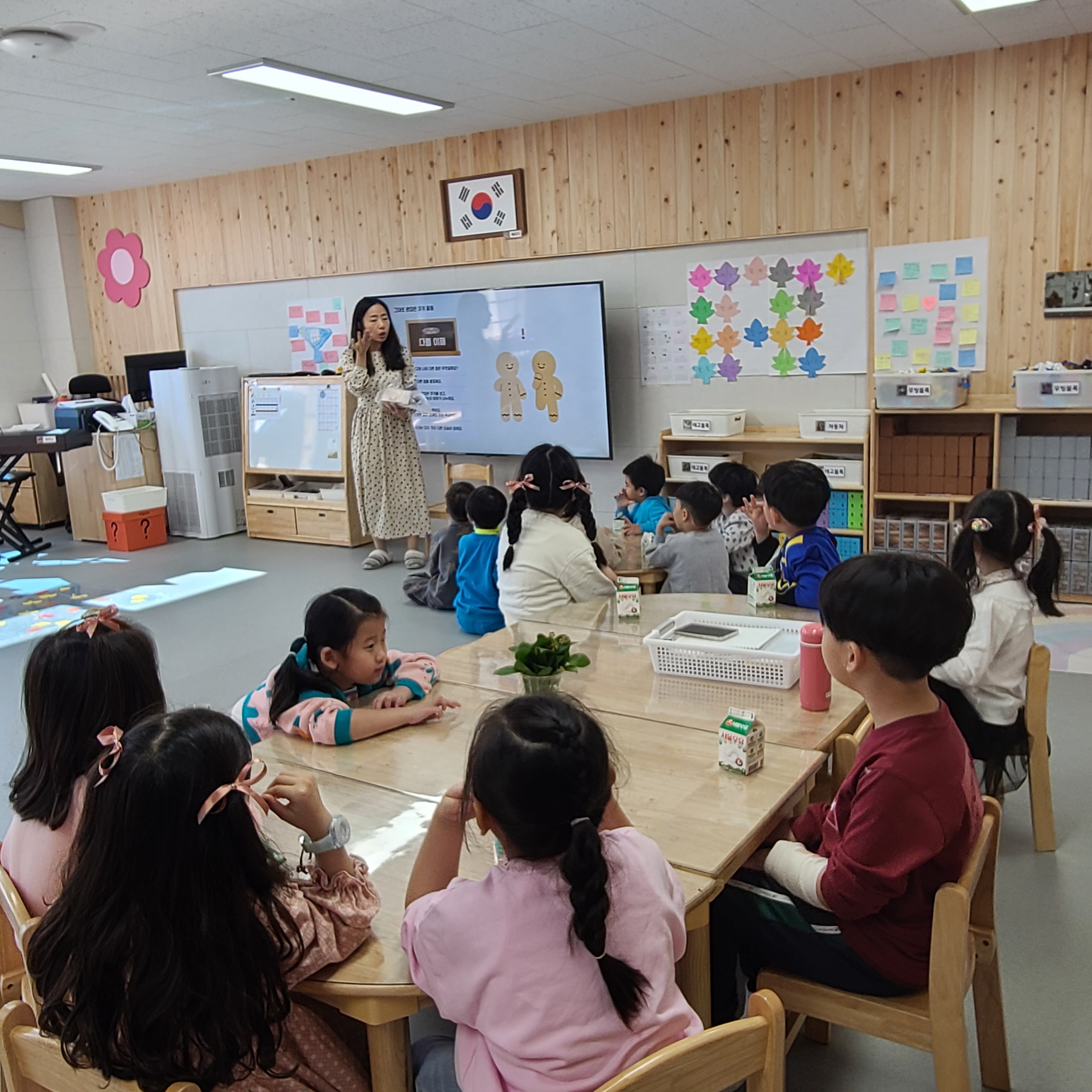 이날 교육은 ‘누가 누가 쿠키를 가져갔나’ 동요를 부르며 시작되었고 유치원 친구들과 나의 다른 점을 찾고 다른 점을 친구들과 함께 이야기 나눈 후, 쿠키를 나누어주고 쿠키가 어떻게 생겼는지 나누고 모양은 달라 보여도 맛은 똑같다는 것을 설명하였다. 우리 모두가 각자 다른 모습, 능력이 있듯이 ‘있는 그대로 괜찮음’을 깨달아가는 과정으로 진행되었다.