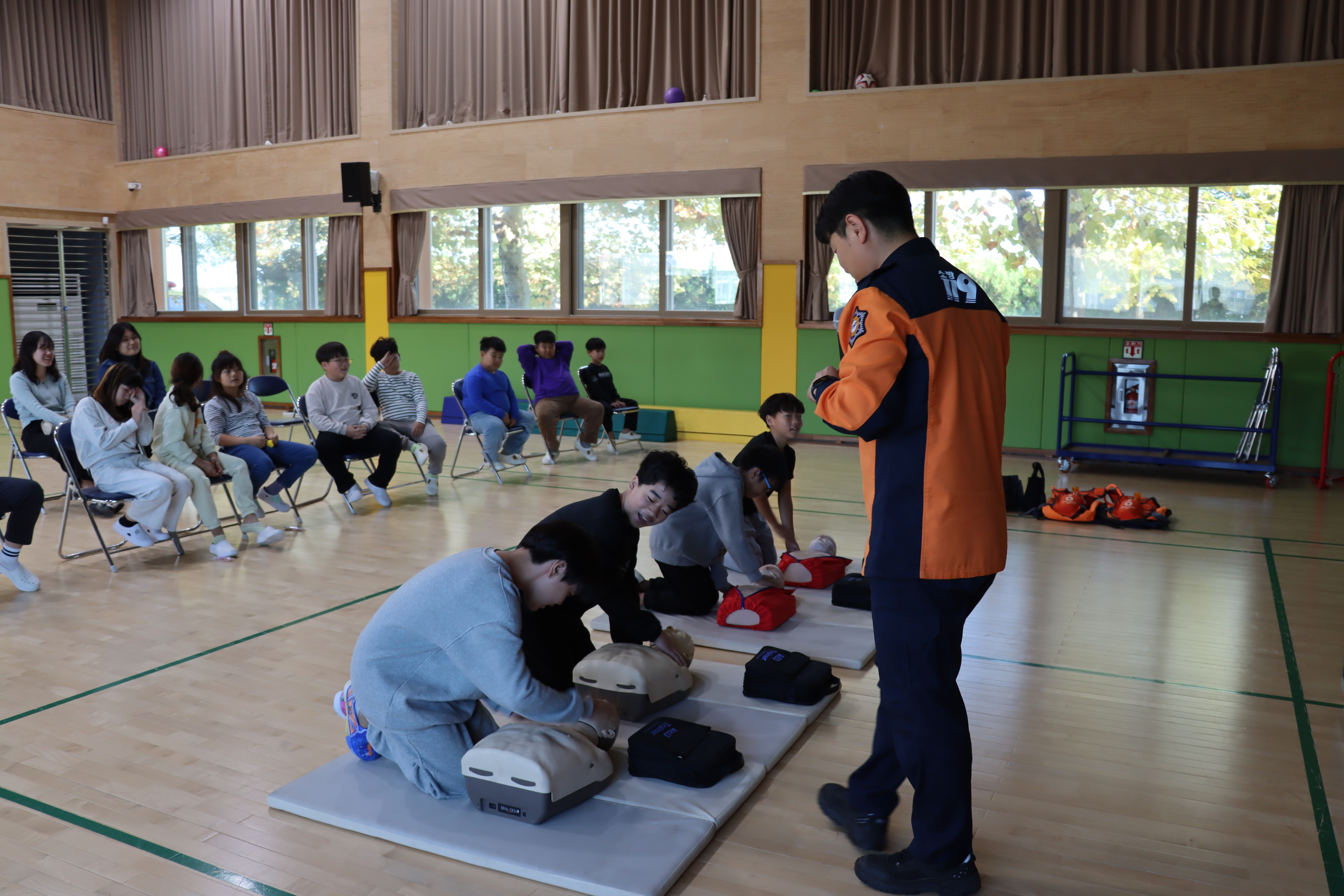 영덕 원황초등학교(교장 서정숙)는 2023년 11월 7일(화) 영덕 소방서와 함께 초등학교 전교생이 참여한 응급처치, 심폐소생술 교육을 실시하였다.