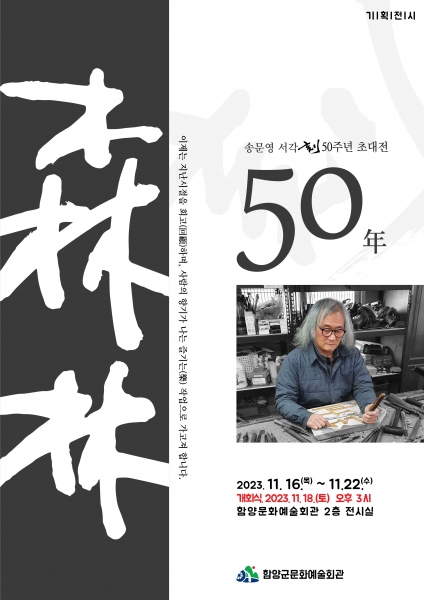 [금요저널] 함양군 문화시설사업소는 오는 16일부터 함양군문화예술회관 전시실에서 ‘삼림 송문영 작가’의 서각 50주년 초대전이 개최된다고 밝혔다.