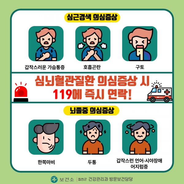 보건소 관계자는 “심근경색과 뇌졸중의 골든타임은 심근경색은 2시간 이내, 뇌졸중은 3시간 이내인 만큼 의심 증상을 미리 알고 환자가 발생한 경우, 즉시 119에 연락해 치료가 가능한 응급실에 방문하는 것이 가장 중요하다”고 강조했다.