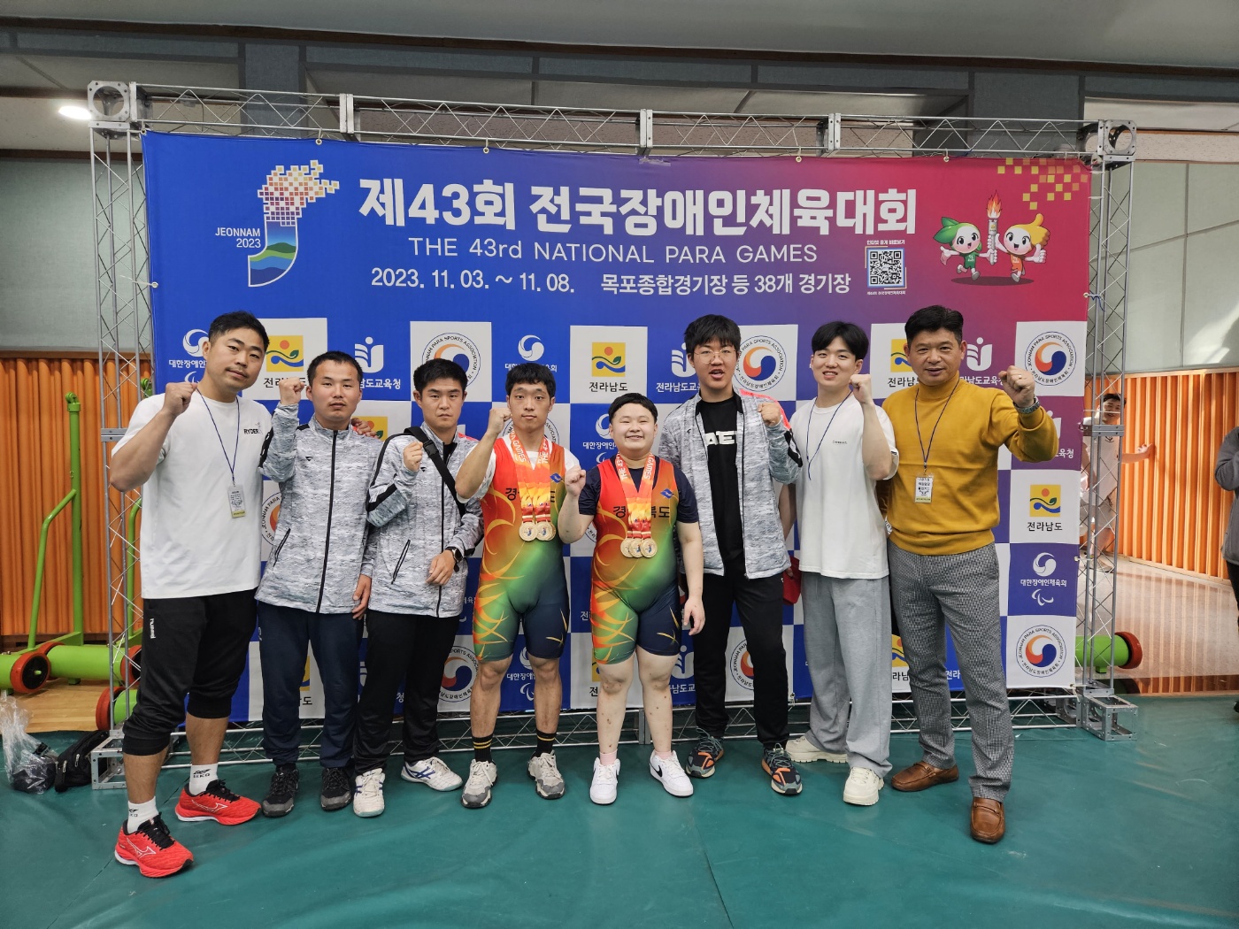 □ 2023. 11. 3.(금) ~ 11. 8.(수) 6일간 전라남도가 주관하고 대한장애인체육회가 주최한 ‘제43회 전국장애인체육대회’는 17개 시도 선수단에서 선수, 임원 및 관계자 포함 9,000명이 참가했다. 우리 학교는 이번 대회에 역도에 2명이 참가하여 출전한 선수 모두 금메달을 받았다.