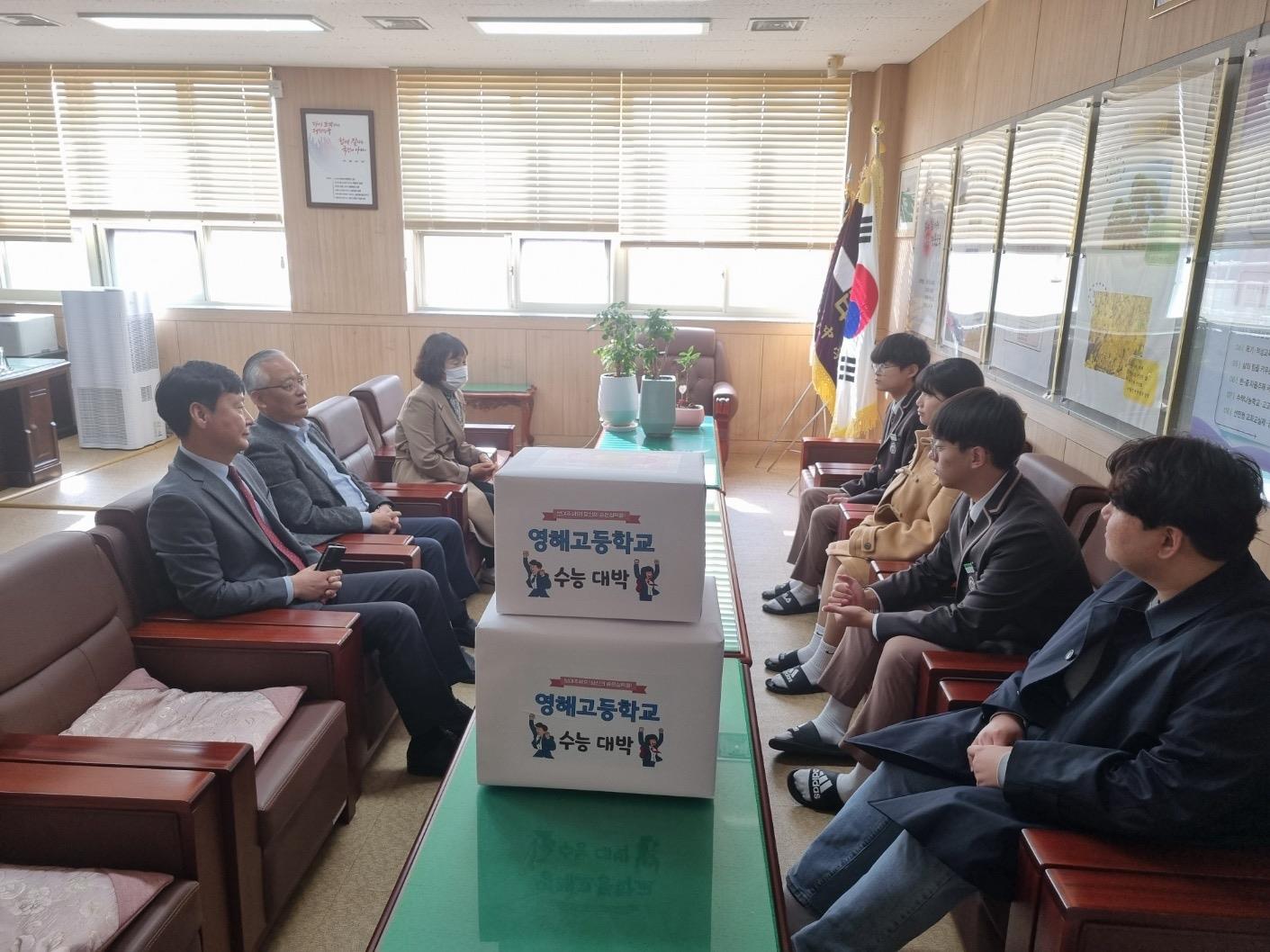 □ 경상북도영덕교육지원청(교육장 윤인한)은 11월 8일(금) 관내 영덕고등학교 외 2개 학교를 찾아 대입 수험생 대표학생과 학교 관계자들을 따뜻하고 정감있게 응원하고 수능 시험장의 설치, 운영 전반을 점검했다.