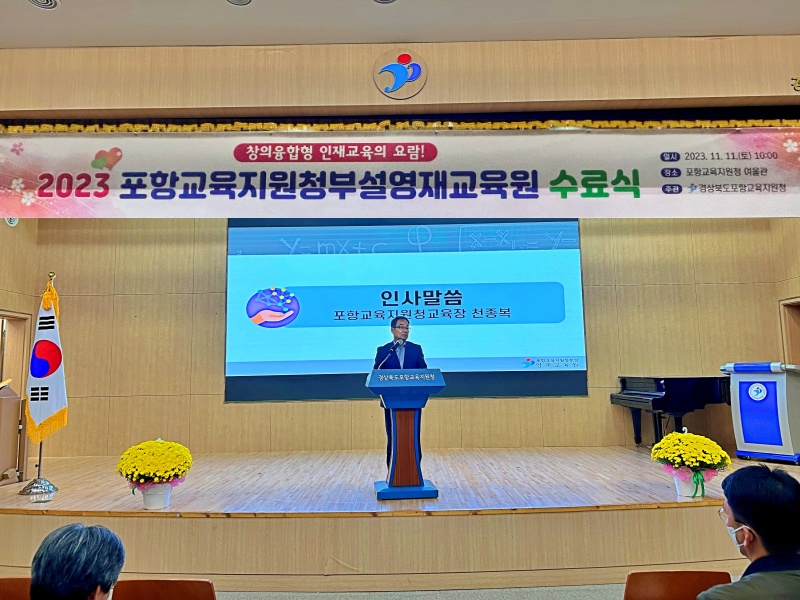 □ 포항교육지원청(교육장 천종복)은 2023년 11월 11일(토) 10시, 포항교육지원청 여울관에서 2023학년도 영재교육원 교육과정을 이수한 7개 과정, 135명의 수료생과 학부모님 150여 명이 참석한 가운데 2023학년도 포항교육지원청부설영재교육원 수료식을 실시하였다.
