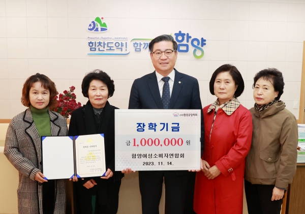 이날 함양여성소비자연합회 이금순 회장과 회원들이 함양군을 방문해 지난 별빛달빛 마을 축제 등을 통한 수익금 일부인 100만원을 함양군장학회에 장학금을 전달했다.