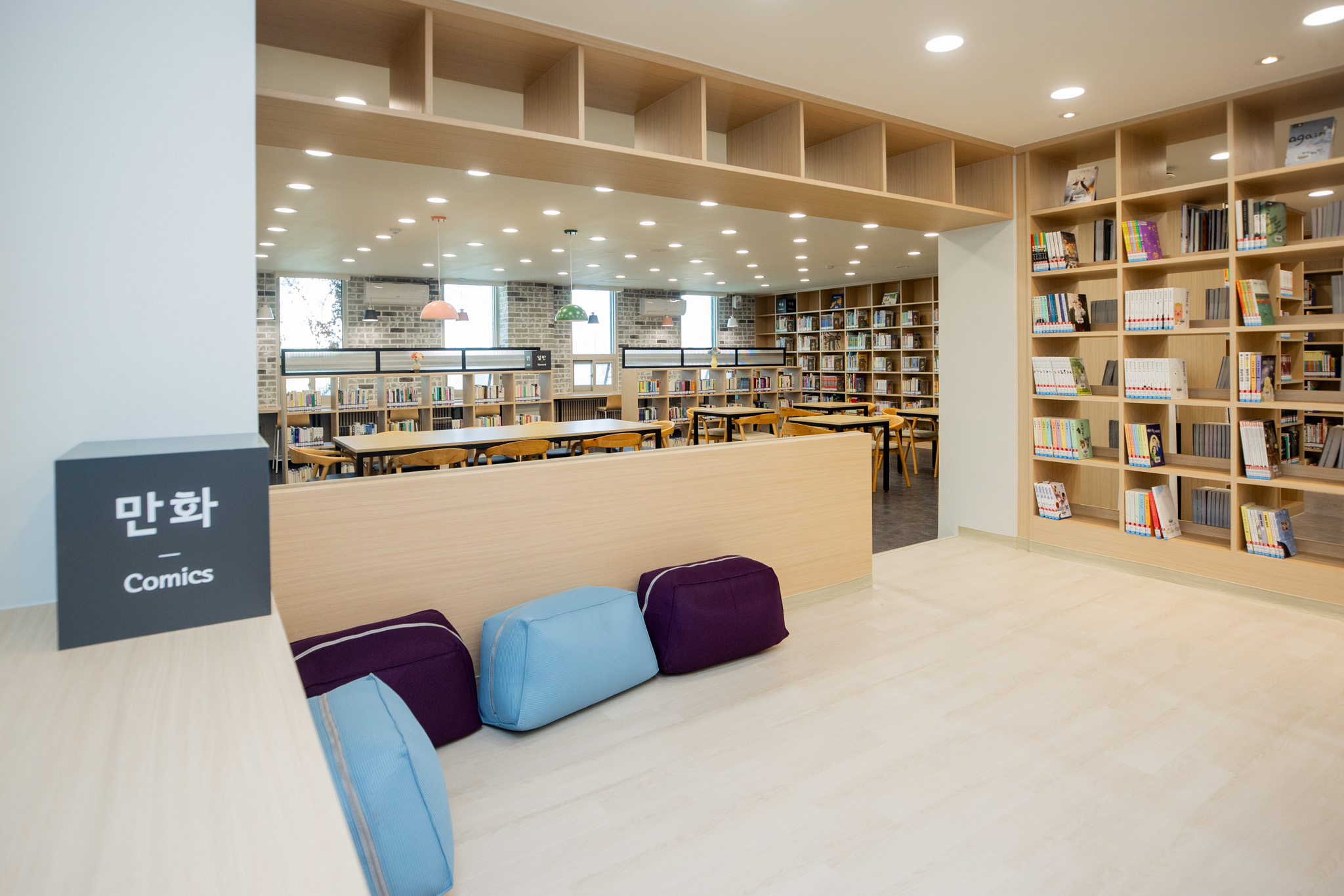 특히 중앙에는 온돌이 깔린 아늑한 마루형 열람석을 조성하고, 만화책 1,000권을 서가에 비치해 세대를 아우르는 만화 특성화 공간을 연출했다.