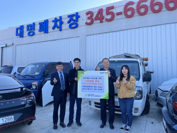 [금요저널] 대명종합폐차장과 굴렁쇠폐차장은 이달 14일 추워지는 날씨에 어르신들이 따듯하게 겨울나기를 바라는 마음으로 지역 내 취약계층 어르신들을 위해 200만원 상당의 난방용품을 김해시서부노인종합복지관에 전달했다.