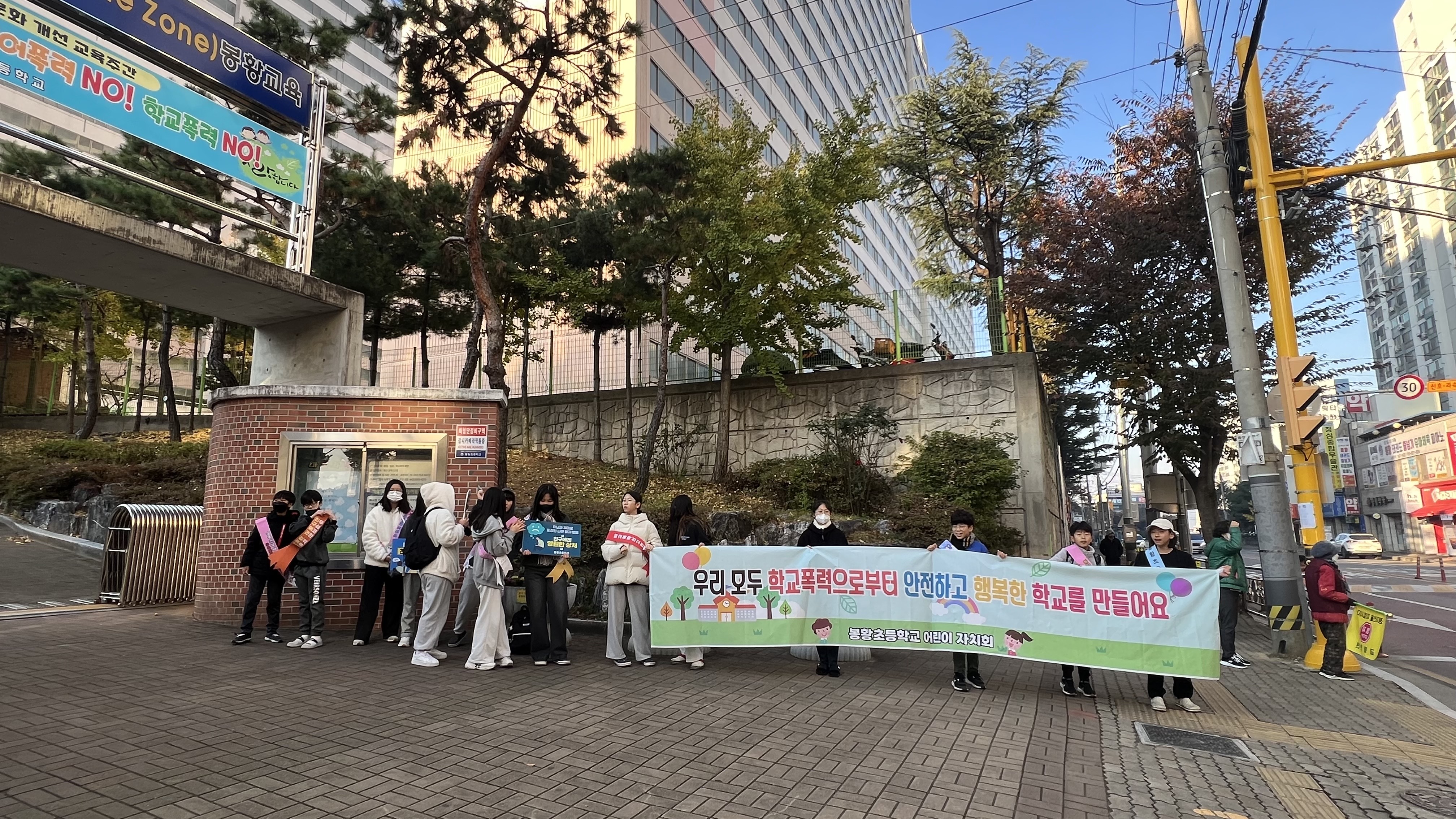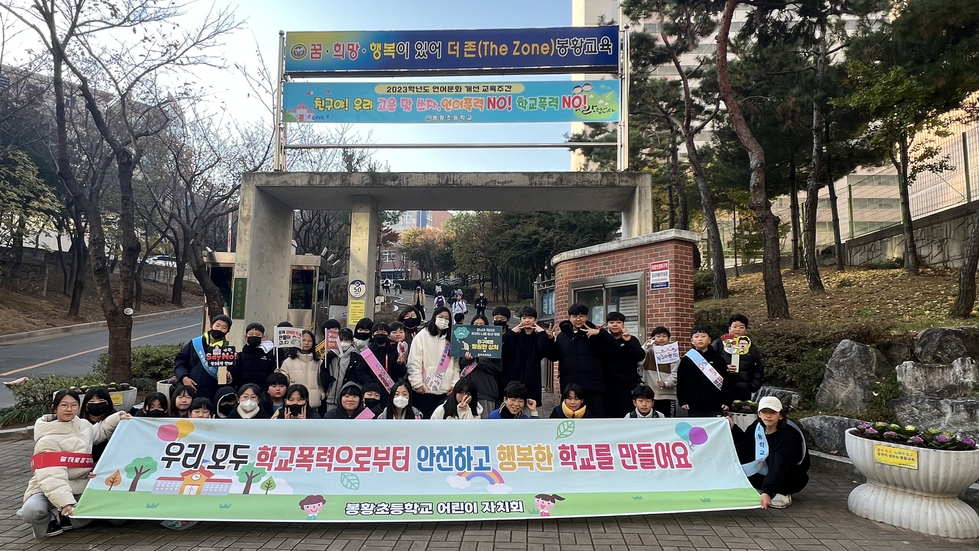 □ 봉황초등학교(교장 허홍렬) 학생자치회는 2023년 11월 15일(수) 오전 8시 10분부터 학교 정문에서 학교폭력예방 캠페인을 실시하였다.