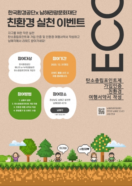 [금요저널] 남해관광문화재단은 기후위기에 대응하고 탄소 중립 문화를 확산하기 위해 한국환경공단과 손잡을 잡고 11월 15일부터 12월 31일까지 친환경 실천 이벤트를 진행한다고 밝혔다.