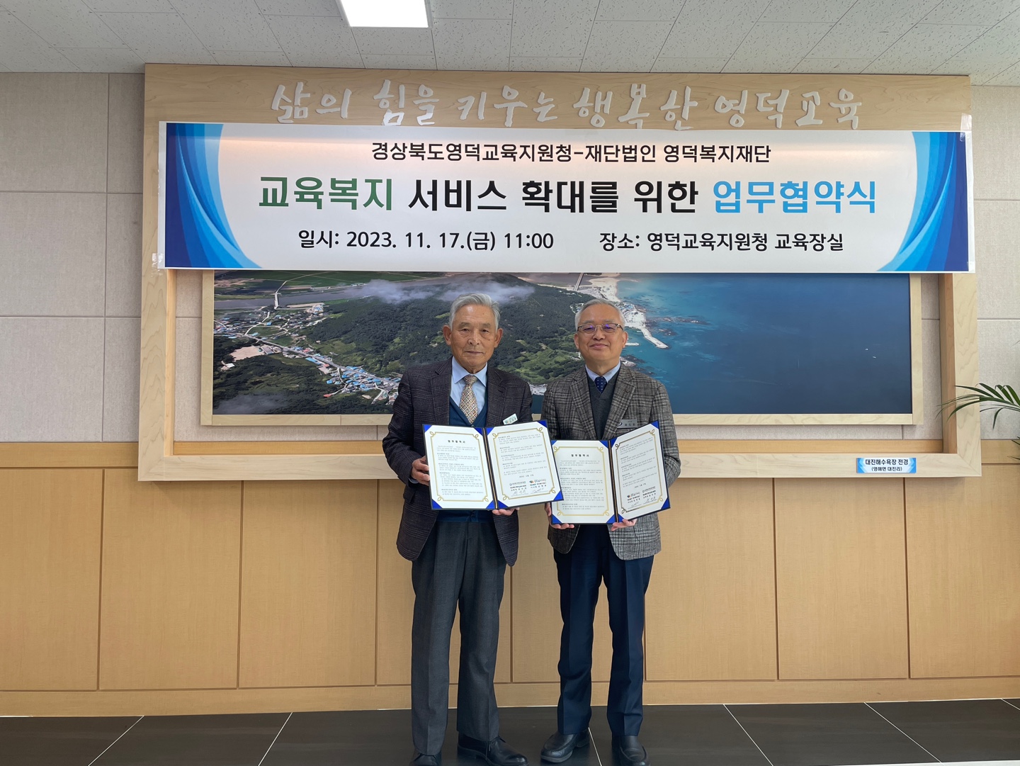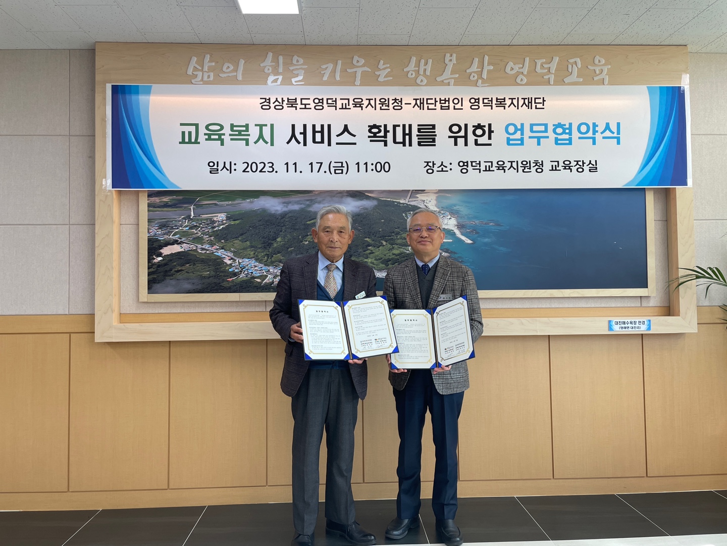 □ 영덕교육지원청(교육장 윤인한)은 11월 17일 재단법인 영덕복지재단(이사장 김명용)과 교육복지 서비스 확대를 위한 업무협약을 체결했다.
