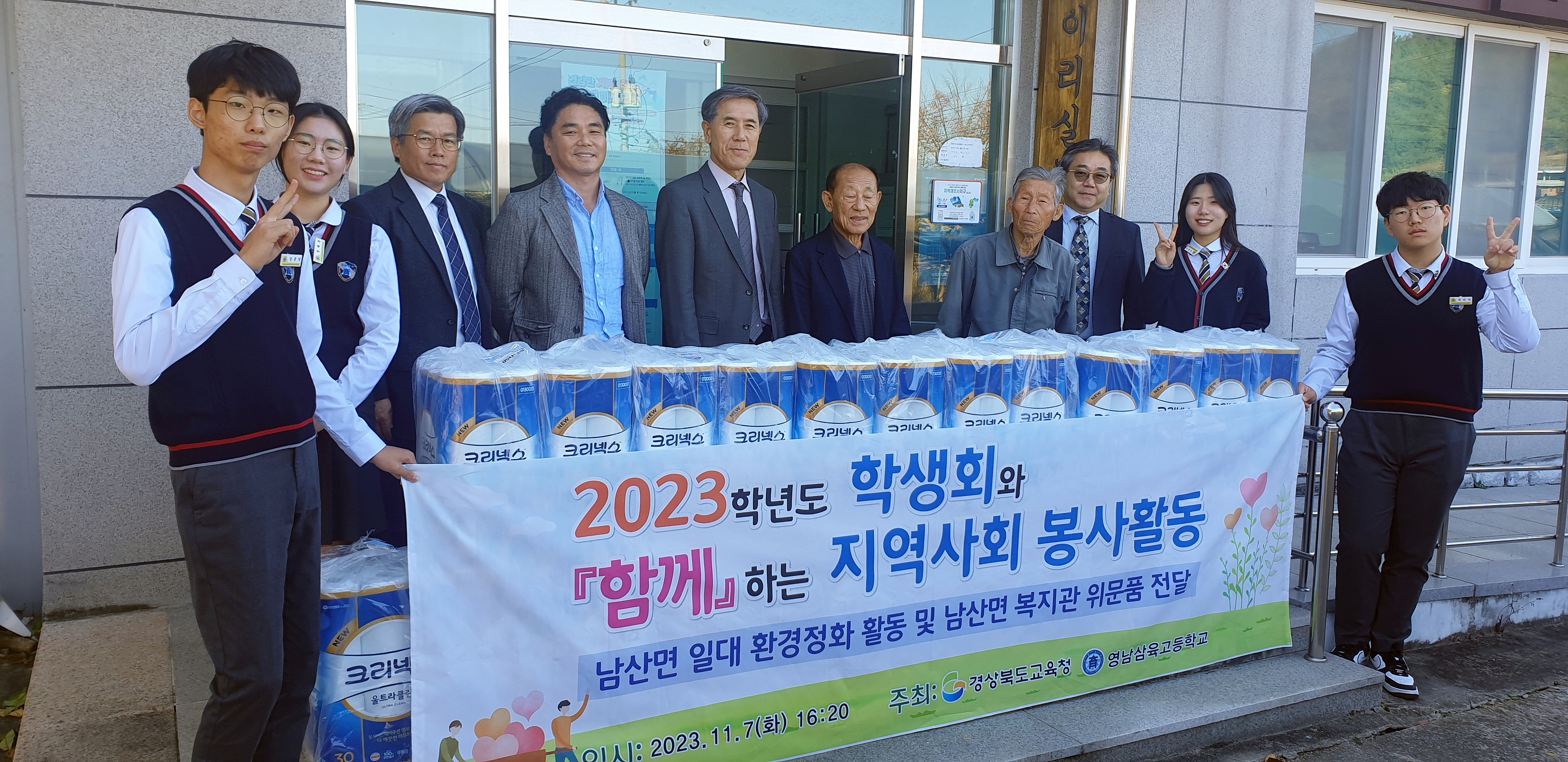 - 영남삼육고등학교는 지역사회와 함께하는 나눔을 지속적으로 실천해오고 있다. 이달 7일 학생자치회 임원 및 교직원은 ‘학생회와 함께하는 지역사회 봉사활동’의 일환으로 남산면 복지회관, 송내리 경로당, 조곡리 경로당을 방문하여 위문품을 전달하고 환경정화 활동을 진행했다.