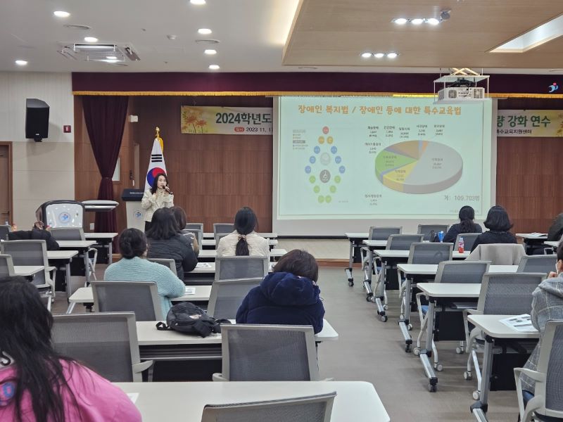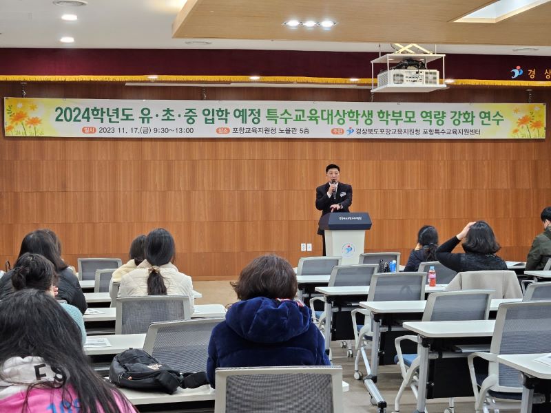 포항교육지원청(교육장 천종복)은 2023년 11월 17일(금) 9:30~13:00 포항교육지원청 노을관에서 2024학년도 유․초등학교 입학 예정 특수교육 대상학생 학부모 80명을 대상으로 특수교육 대상학생 학부모 연수를 실시하였다.