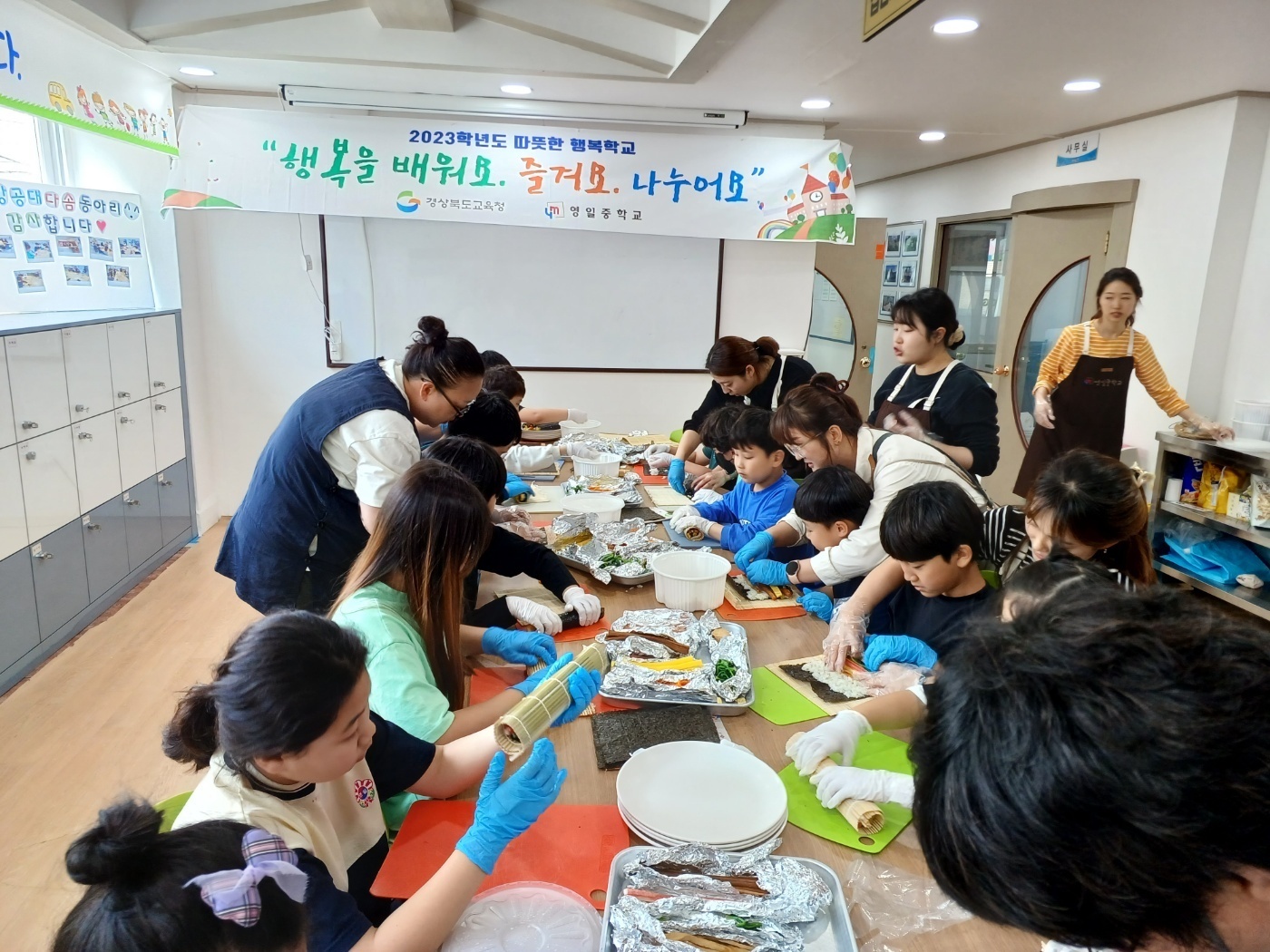 영일중학교(교장 정경일)는 교육복지우선지원사업 나누미 봉사단 학생들과 행복학교에 참가하는 선생님들과 함께 다사랑지역아동센터 학생들에게 폭립, 소금빵, 감자튀김을 만들어 11월 18일(토) 전달하였다.