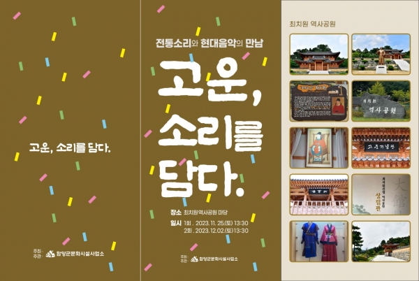 [금요저널] 함양군은 오는 11월 25일과 12월 2일 2회에 걸쳐 최치원 역사공원에서‘고운, 소리를 담다’ 퓨전국악 공연을 개최한다고 밝혔다.