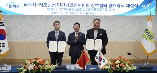 박정 의원에 따르면, 21일 파주시청 대회의실에서 파주시와 중국 랴오닝성 민간기업위원회 간 상호협력을 위한 양해각서 체결식이 열렸다.