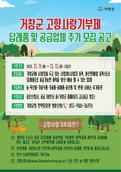 모집 대상은 현재 거창군에 사업장을 두고 답례품으로 선정된 품목을 생산·제조·공급할 수 있어야 하며 기부 시스템인 고향사랑e음을 통해 공급해야 하는 만큼 통신판매업 등록을 완료한 업체이어야 한다.