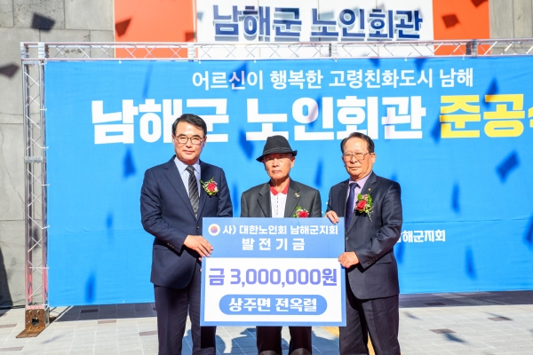 [금요저널] 남해군은 ‘남해군 노인회관 준공’을 기념해 상주면에 거주하는 전옥렬 씨가 ‘대한노인회 남해군지회’에 300만원을 기탁했다고 밝혔다.